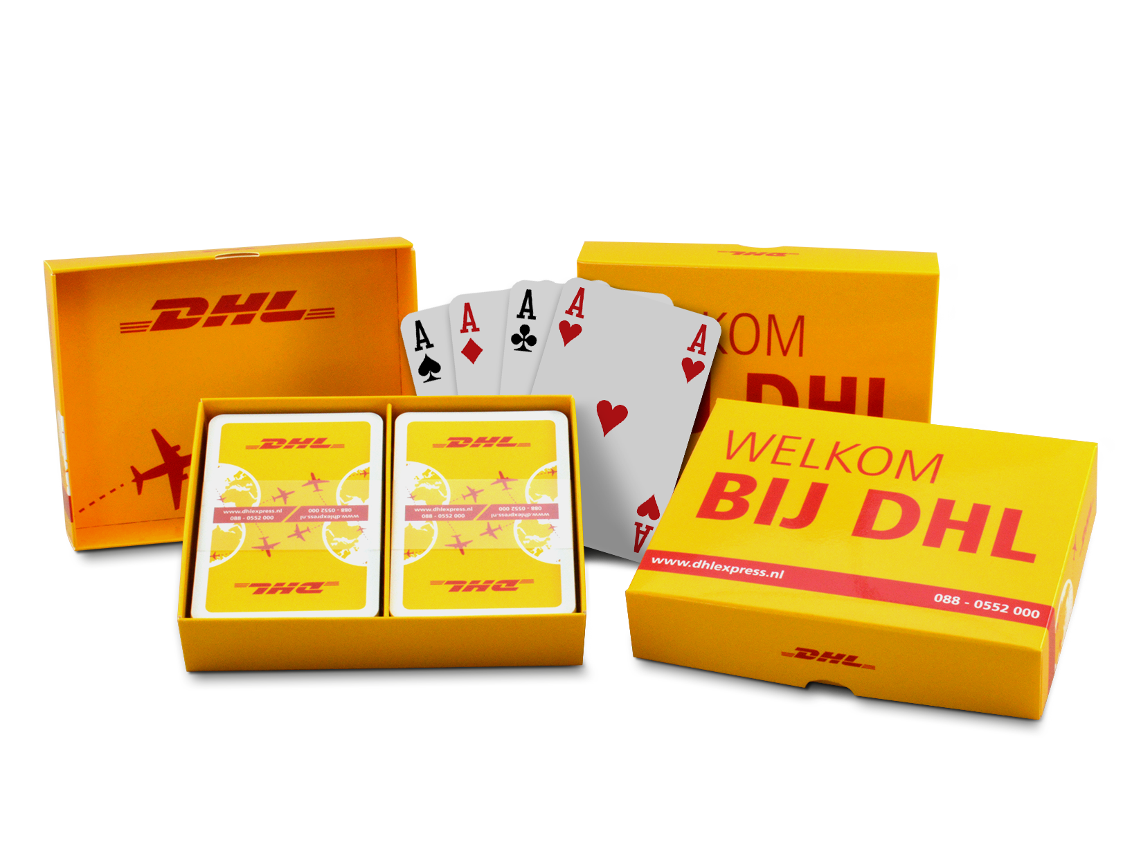 2 decks of cards, with banderole in a beautiful laminated box that can be printed all-over in Full Colour. The cards are made of 320 gram real playing card cardboard or 305 gram mono carton and have the international Bridge format.